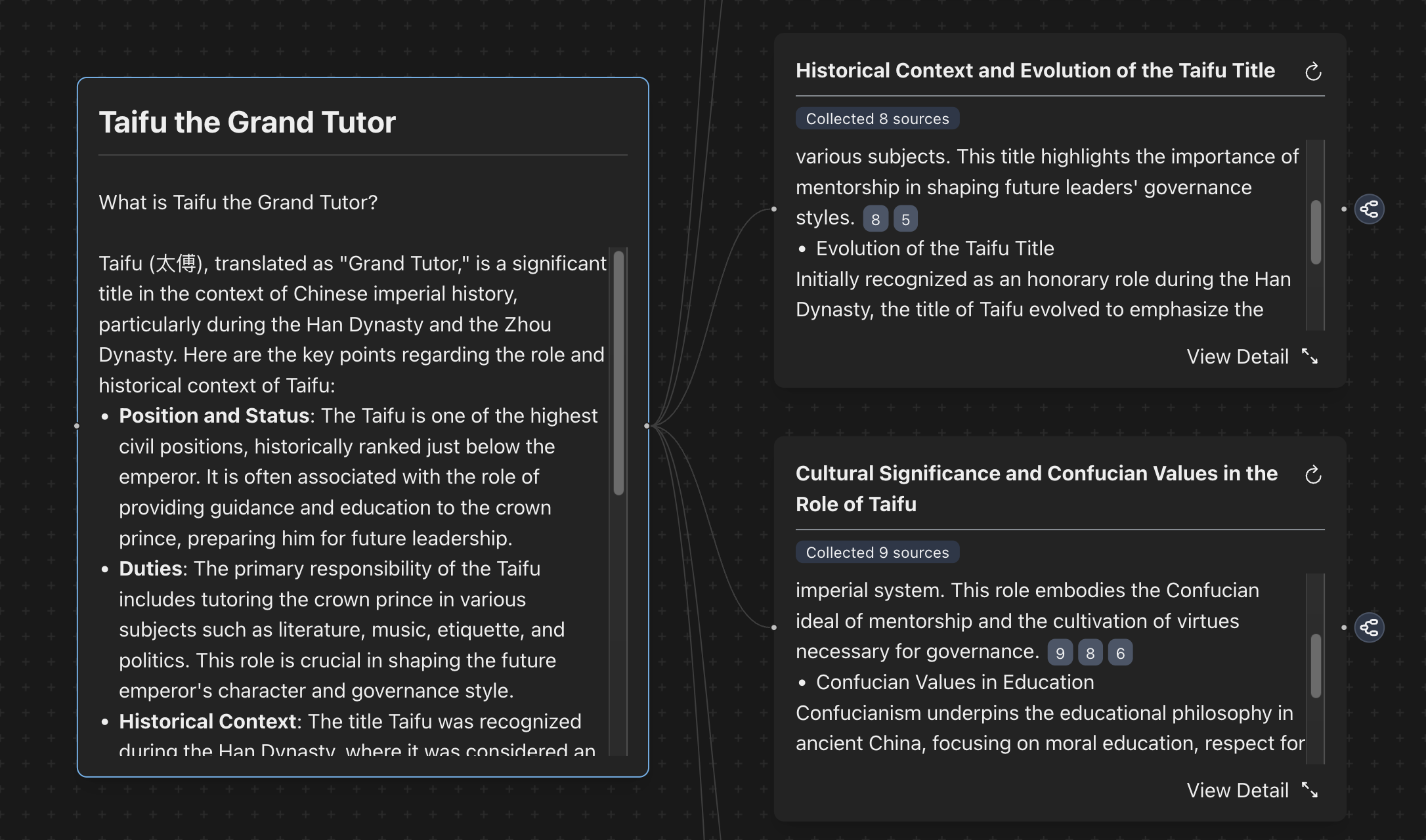 On Taifu.AI, you can describe your ideas, and insights will be automatically organized into mind map nodes. Each node displays sources we've collected from the internet along with a generated summary. Want to delve deeper? Chat with Taifu on any node or simply press tab to get topic suggestions!